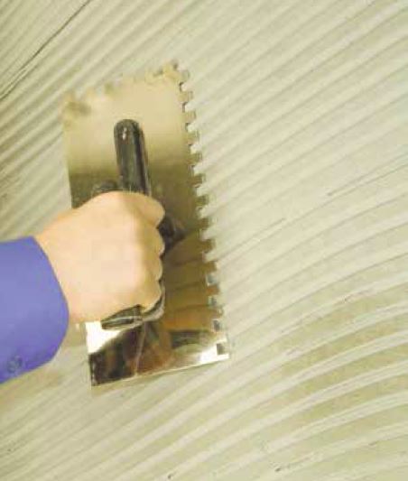 Encoller le support avec une taloche lise en acier, ensuite l’étaler de façon uniforme et peigner (dans une seule direction si possible) en utilisant une taloche crantée.