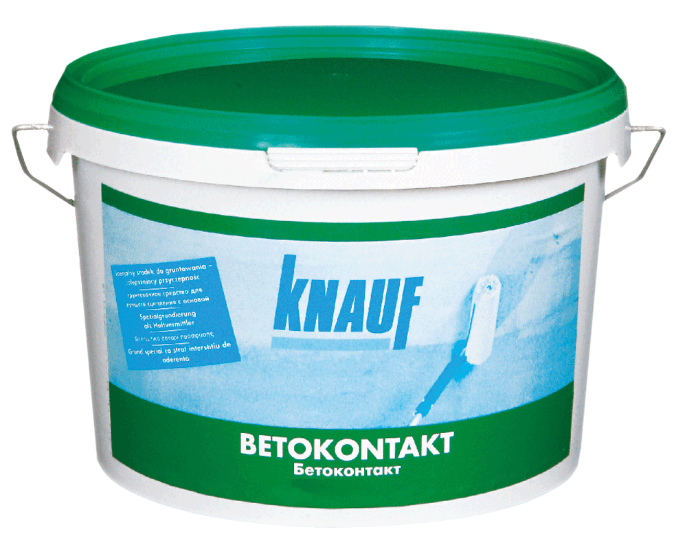 Pont d’accrochage pour l'enduisage de supports à faible pouvoir d’absorption. Recommandé pour les bétons à coffrage lisse. Application mécanique ou à l’aide d’un rouleau en peau de mouton. Knauf Betokontakt est destiné, à l’intérieur, au traitement de supports minéraux tels que les bétons qui par leur densité importante ainsi que leur faible pouvoir d’absorption d’eau, ne permettent pas une application directe de l’enduit de plâtre. Le Knauf Betokontakt doit constituer un pont d’accrochage entre le support peu adéquat et l’enduit à appliquer. L’utilisation du Knauf Betokontakt est surtout recommandée pour les bétons à coffrage lisse coulés sur chantier ou pour des plafonds constitués d’éléments en béton préfabriqués ou précontraints. Egalement lors de la pose de plaques de plâtre par collage sur ces types de support Le Knauf Betokontakt est une dispersion à base de matière synthétique avec une grande stabilité alcaline, mélangée à du sable quartzeux et du carbonate de calcium finement broyé.