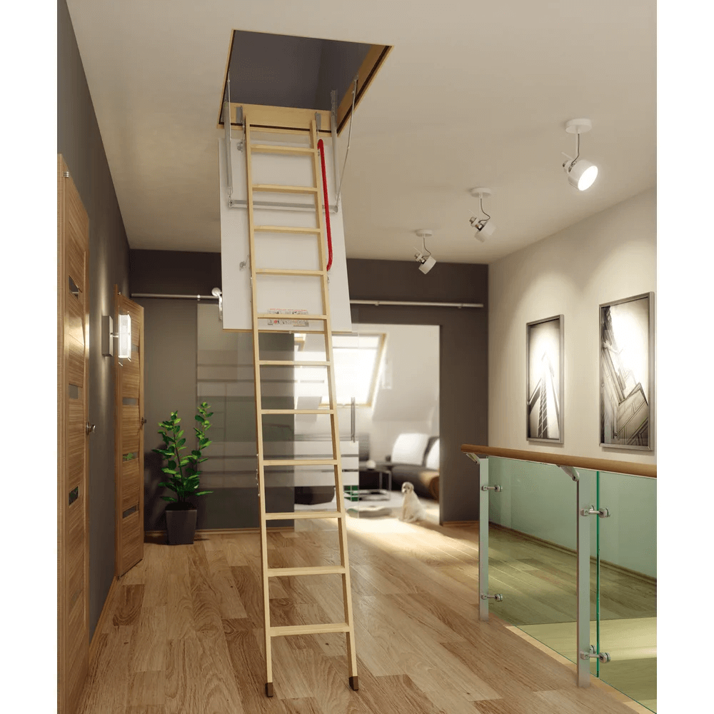 Les solutions innovantes ont été employé dans l’escalier escamotable LWK Plus. Cela garantit le plus haut confort d’utilisation, une très bonne performance thermo-isolante et permettent une installation encore plus facile et plus rapide de l’escalier dans le plafond. C’est un escalier de haute qualité composé de 3 ou 4 segments. Sa trappe blanche possède une finition esthétique. Dans sa version standard, il est équipé d’embouts de protection du sol et une main courante.