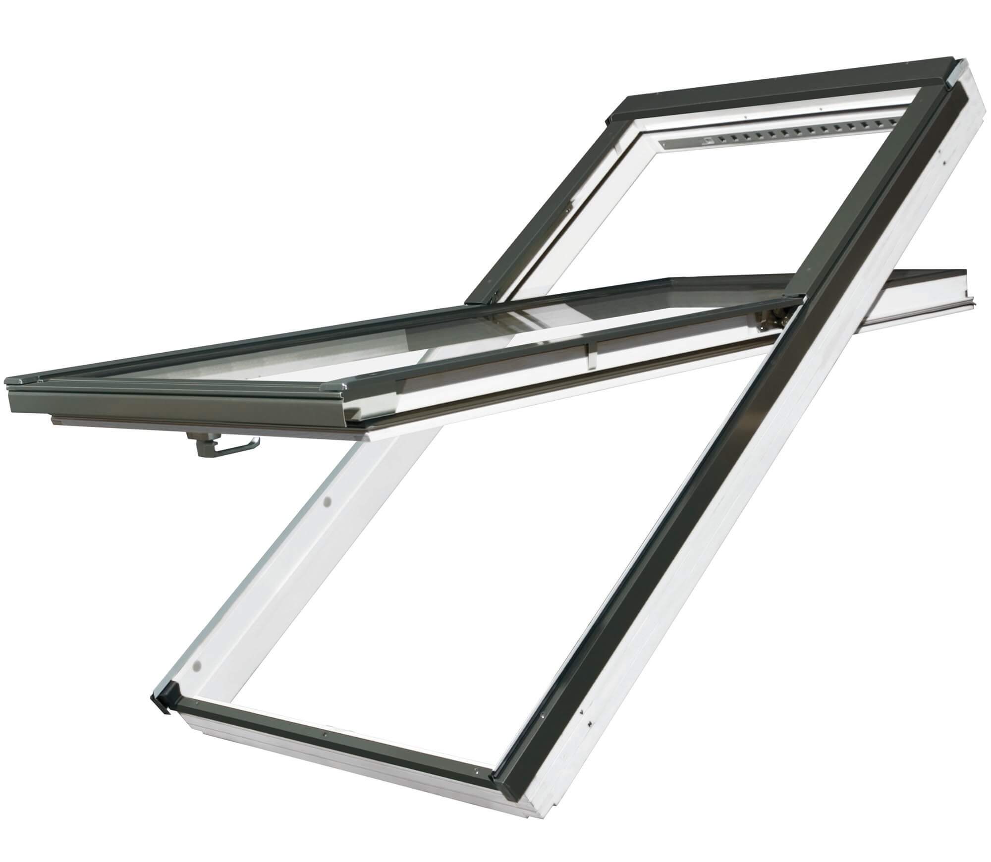 L’axe de rotation est rehaussé par rapport au centre de la fenêtre, de telle sorte qu’une personne, même de grande taille, peut se tenir debout devant la fenêtre. La fenêtre assure une bonne illumination de la pièce et offre en outre une vue dégagée sur l’extérieur. La partie inférieure de la fenêtre a une fonction de projection, tandis que la partie supérieure a plus pour vocation d’apporter davantage de luminosité. Il s’agit de l’unique fenêtre sur le marché qui, installée sur une toiture de pente entre 39º et 43º satisfait les exigences de la norme DIN 5034-1, selon laquelle le bord inférieur de la fenêtre doit se situer à 95 cm du niveau du sol et le bord supérieur à un minimum de 220 cm. La fenêtre avec axe de rotation décentré s’ouvre comme une fenêtre à rotation ordinaire et peut être immobilisée à 160° pour permettre son nettoyage. Ce type de fenêtre peut être pourvu d’accessoires extérieurs et interieurs.