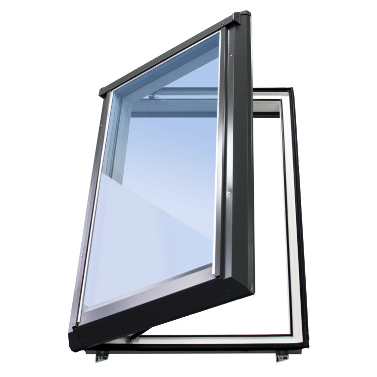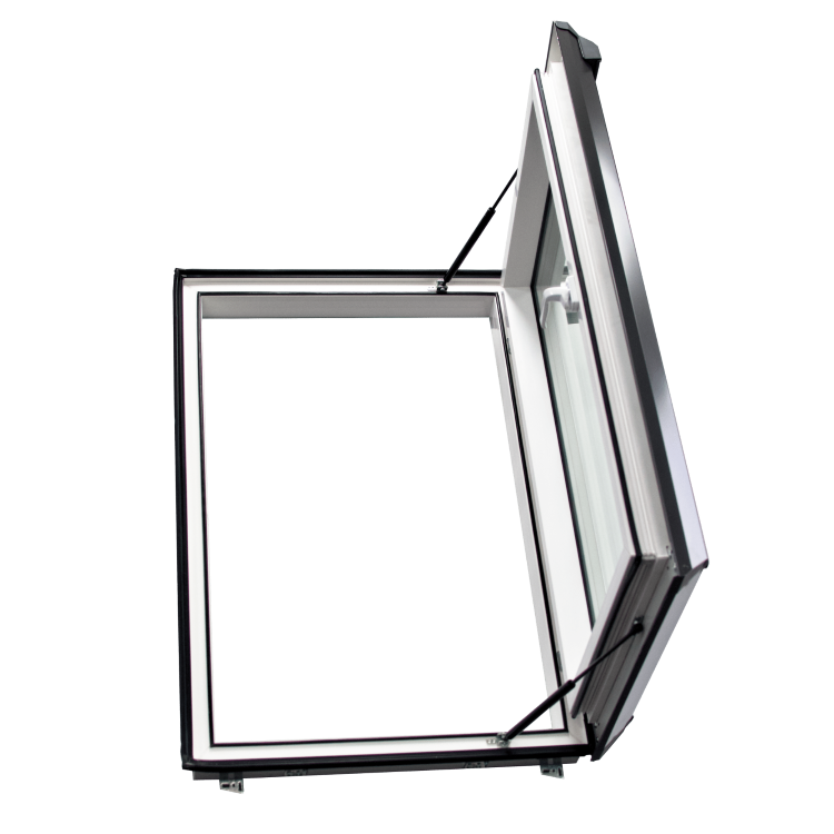 Les tailles 5/7 et 5/9 utilisent toujours la charnière de verrouillage éprouvée pour faciliter l'ouverture et la fermeture manuelles. Dans les plus grandes tailles (6/9, 6/11, 7/9 et 7/11), en revanche, des doubles vérins à gaz avec fonction d'amortissement sont installés pour garantir un fonctionnement sûr et fluide. Cela rend l'ouverture de la fenêtre encore plus facile.
