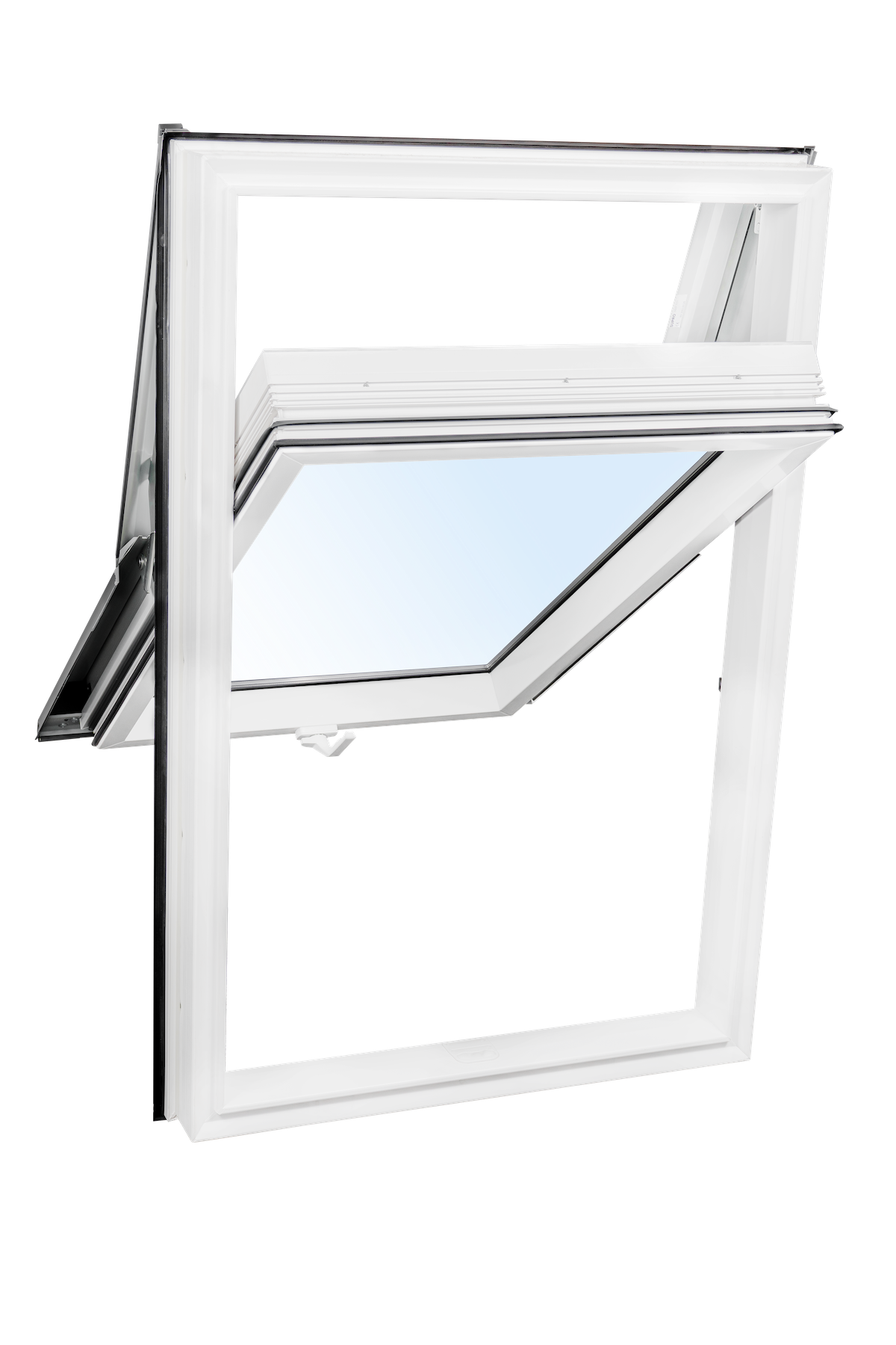 Grâce à axe de rotation surélevé innovant situé aux 3/4 de la hauteur du cadre, lorsqu'elle est ouvert, le châssis de la fenêtre "ne pénètre pas à l'intérieur", n'occupant donc pas la surface de la pièce, grâce à quoi il se caractérise par une meilleure fonctionnalité et un plus grand confort d'utilisation. Cette structure assure un accès libre et sûr à la fenêtre ouverte en position verticale.