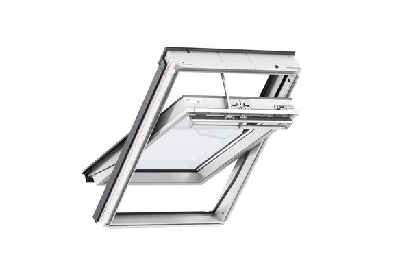 La fenêtre de toit GGU de VELUX est une fenêtre de toit de pivotement central peinte en blanc avec la barre de manœuvre en partie haute pour le maniement confortable. Le design amélioré permet d'ouvrir et de fermer la fenêtre avec une seule main. La barre de manœuvre dans la partie supérieure rend la manipulation facile même si les meubles sont placés directement sous la fenêtre.