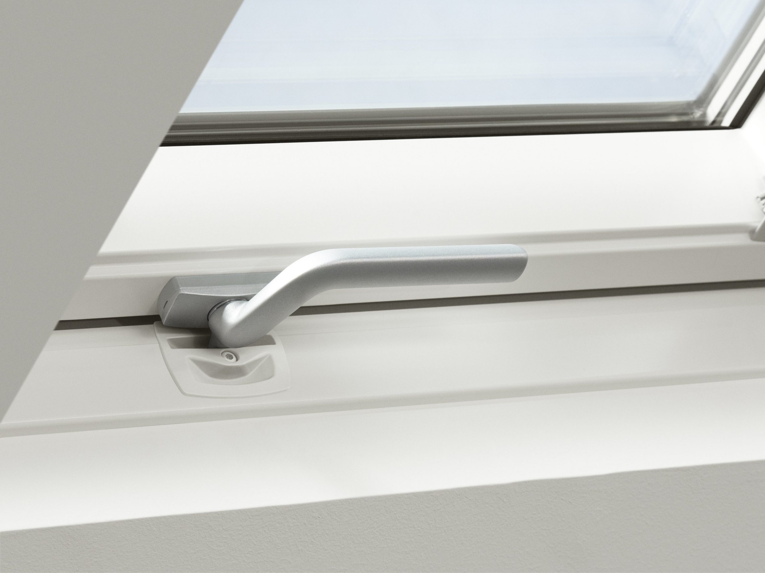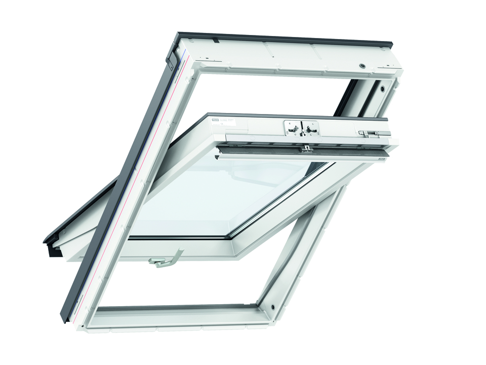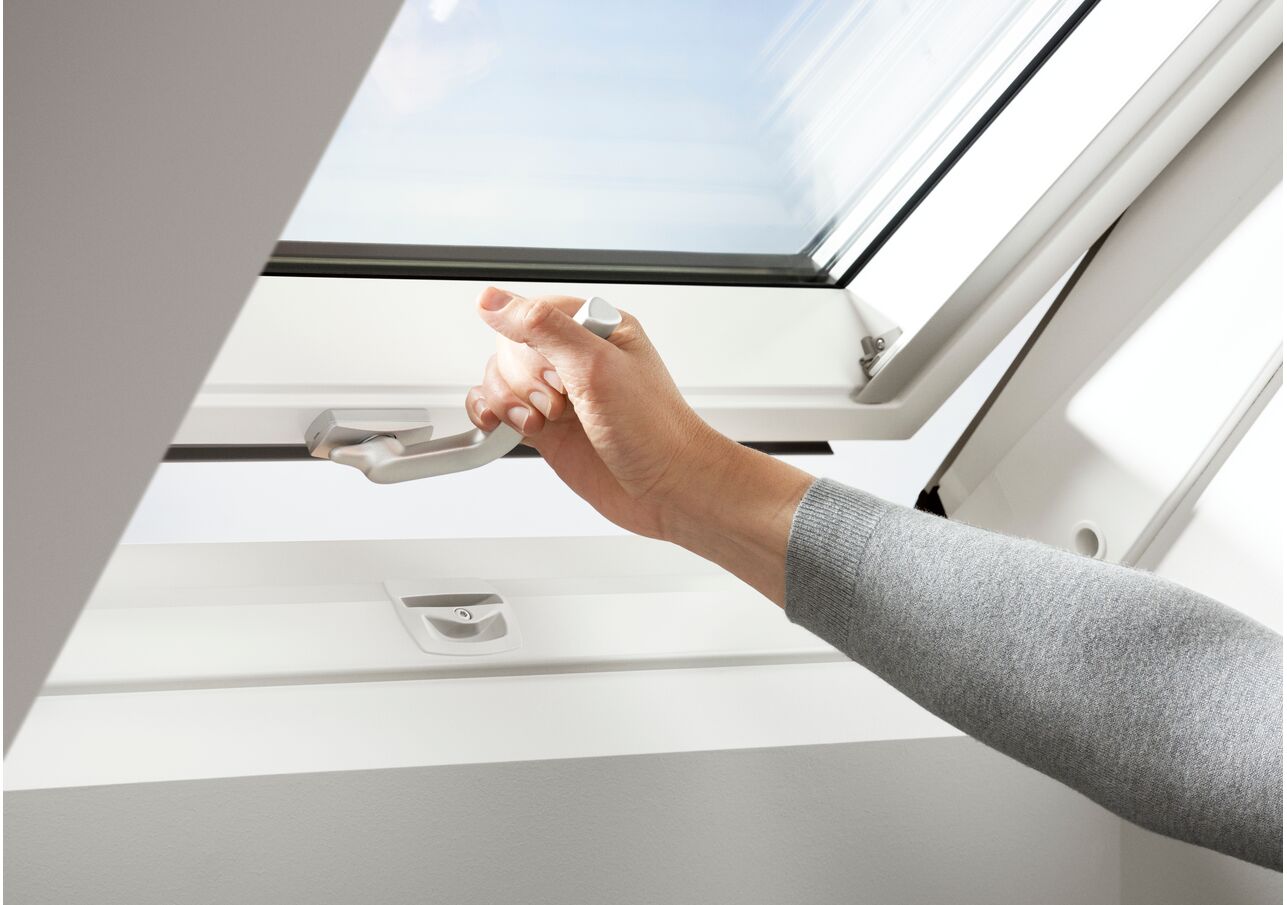 La fenêtre de toit GLU de VELUX est une fenêtre de toit de pivotement central peinte en blanc avec la barre de manœuvre en partie haute pour le maniement confortable. Le design amélioré permet d'ouvrir et de fermer la fenêtre avec une seule main. La barre de manœuvre dans la partie supérieure rend la manipulation facile même si les meubles sont placés directement sous la fenêtre.