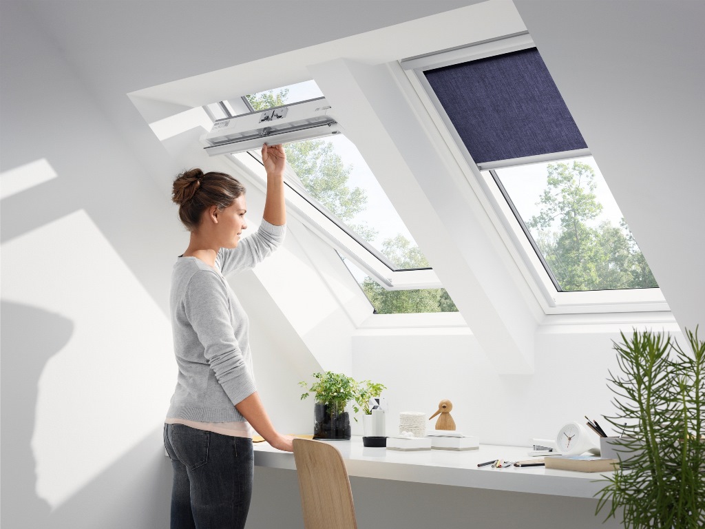 La fenêtre de toit GLU de VELUX est une fenêtre de toit de pivotement central peinte en blanc avec la barre de manœuvre en partie haute pour le maniement confortable. Le design amélioré permet d'ouvrir et de fermer la fenêtre avec une seule main. La barre de manœuvre dans la partie supérieure rend la manipulation facile même si les meubles sont placés directement sous la fenêtre.
