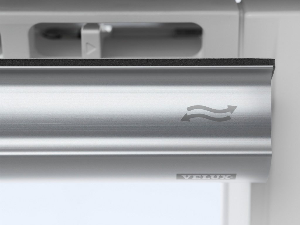 La fenêtre de toit GLU est équipée de clapet de ventilation intégré. Ce clapet unique permet à l'air frais d’entrer dans la pièce à travers un filtre qui bloque la poussière, les insectes et la neige poudreuse même lorsque la fenêtre est fermée. Cette fenêtre de toit est donc idéale pour les jours pluvieux.