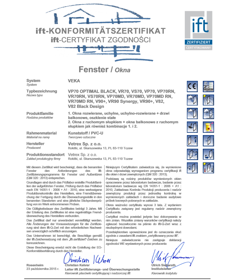 Les fenêtres VP70 constituent une proposition parfaite pour ceux qui cherchent des produits du meilleur rapport qualité-prix. Les fenêtres de cette série répondent à toutes normes européennes. Classiques et élégantes elles s'intégreront à chaque intérieur. L'avantage principal de cette série de fenêtres est le faible coefficient d'isolation thermique ce qui combiné avec une bonne isolation acoustique constitue l'accomplissement de rêves de tous ceux qui apprécient la chaleur et la tranquillité de la maison familiale.