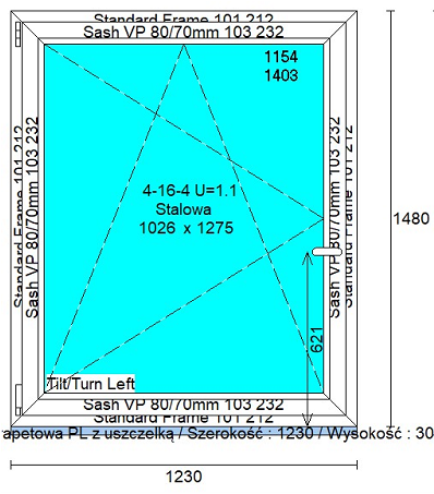 * valeur U pour l'ensemble de la fenêtre à un ouvrant de la dimension 1230x1480 mm