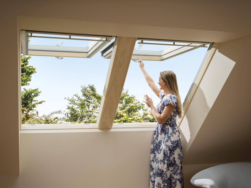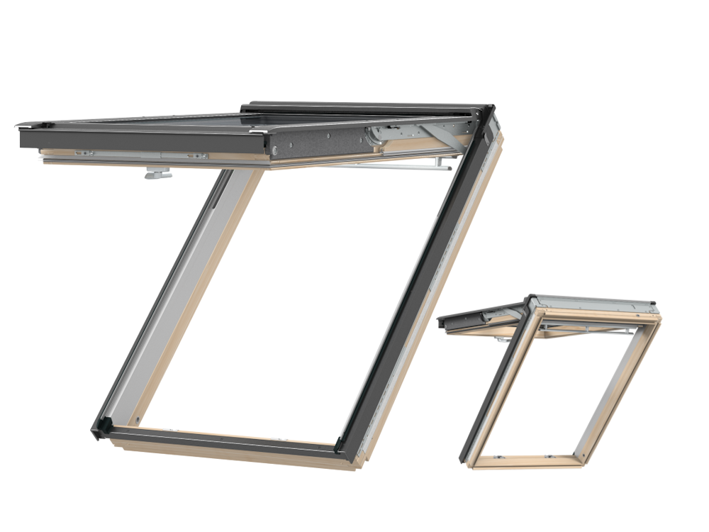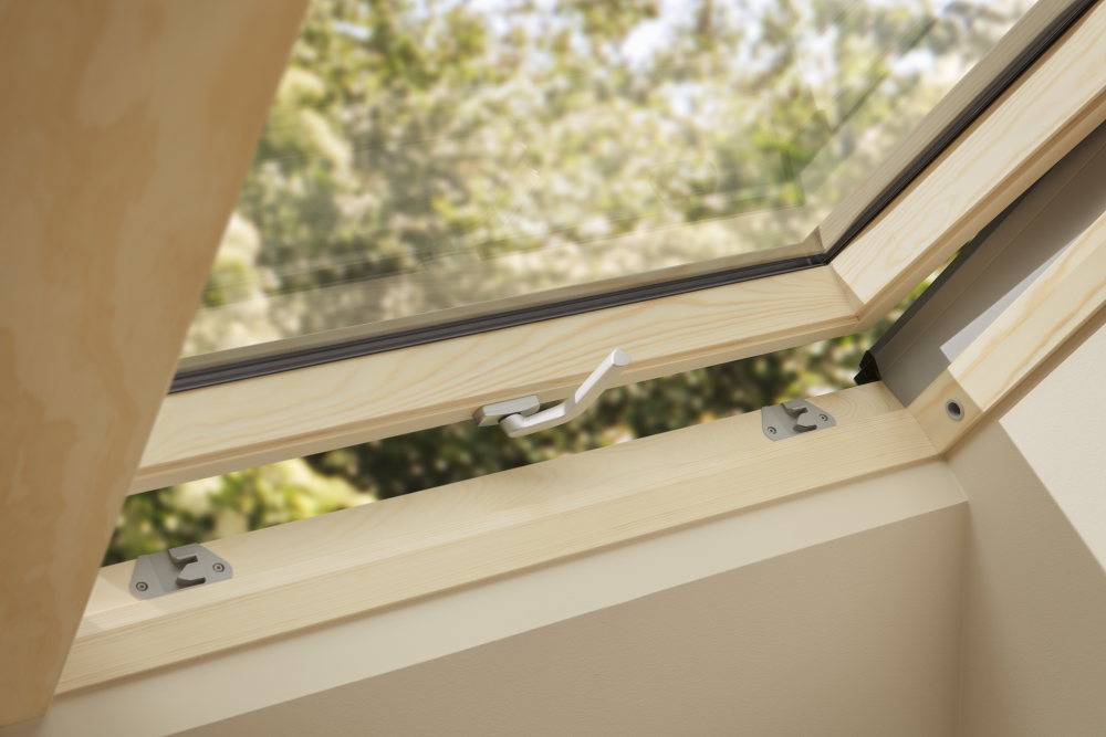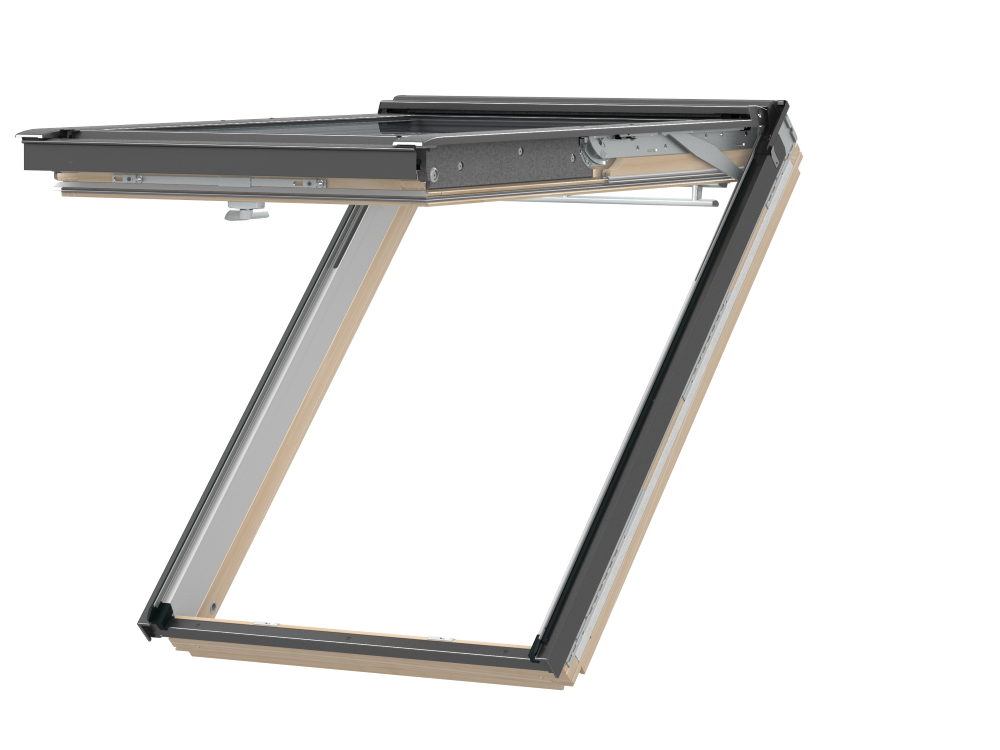 La fenêtre à projection/rotation GNL est équipée d'une poignée ergonomique en bas, qui permet une ouverture continue de l'ouvrant jusqu'à un angle de 45°. En haut, la GNL est équipée de la barre de manœuvre éprouvée et confortable, par laquelle la fenêtre de toit peut être ouverte en position de rotation. L'ouverture en tant que fenêtre à projection permet de se pencher confortablement à l'extérieur et de profiter de la magnifique vue panoramique, tandis que l'option de rotation permet notamment un pivotement à 180° pour le nettoyage. De plus, la ventilation permanente éprouvée est intégrée dans la barre de manœuvre supérieure. Le clapet de ventilation intégré unique permet une aération sans poussière ni insectes, même lorsque la fenêtre de toit est fermée. Très approprié pour les jours de pluie et pour garantir un climat intérieur sain et durable, permettant un échange d'air sans ouvrir la fenêtre.