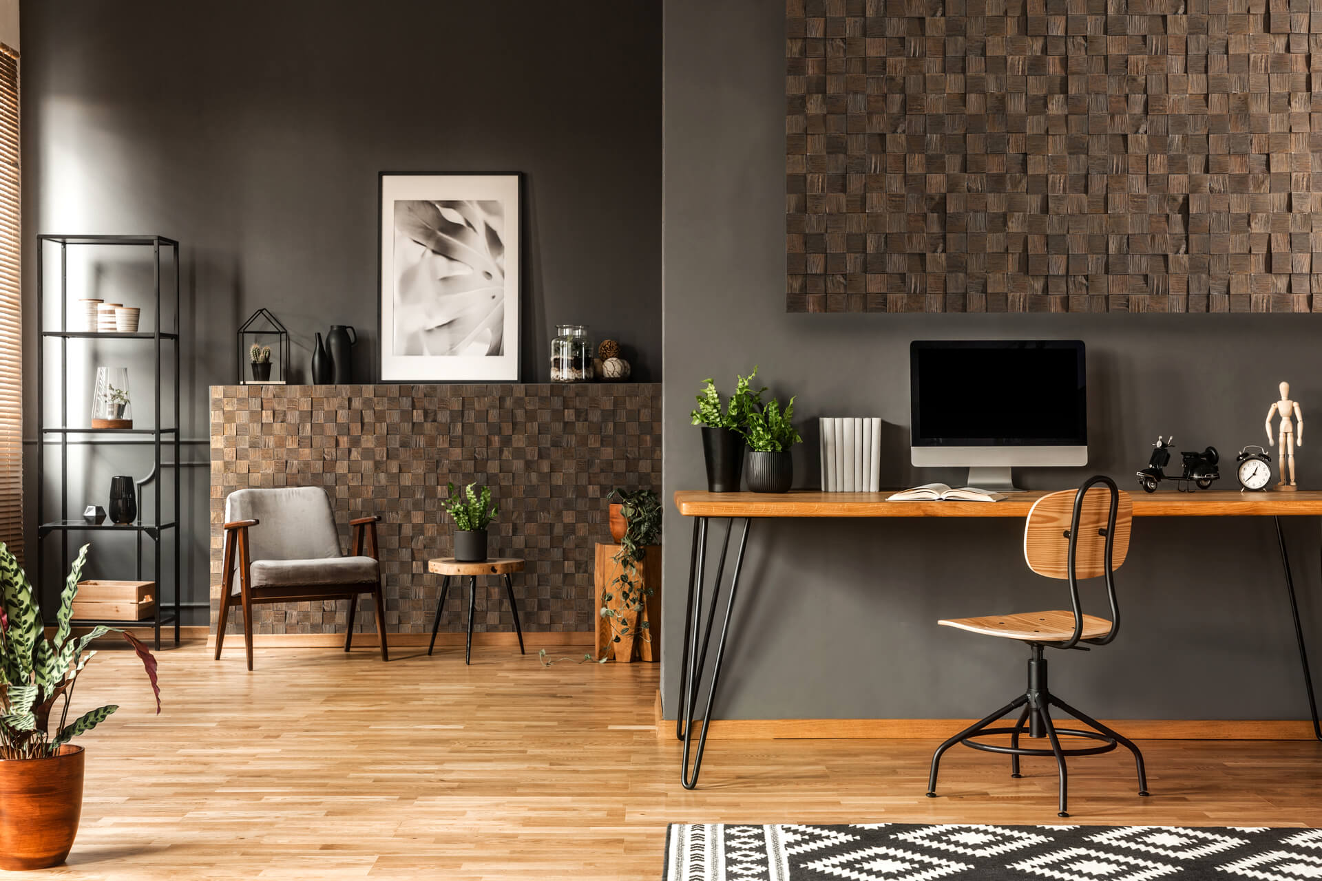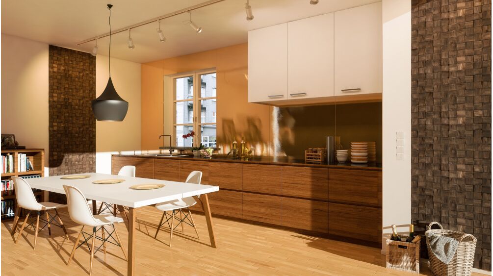 La combinaison des structures et des matériaux embellit chaque pièce. Les panneaux en bois avec un ameublement intéressant donnent de la classe, du chic et de l'élégance intemporelle aux appartements modernes. Un tel espace constitue un endroit idéal pour vivre et travailler.