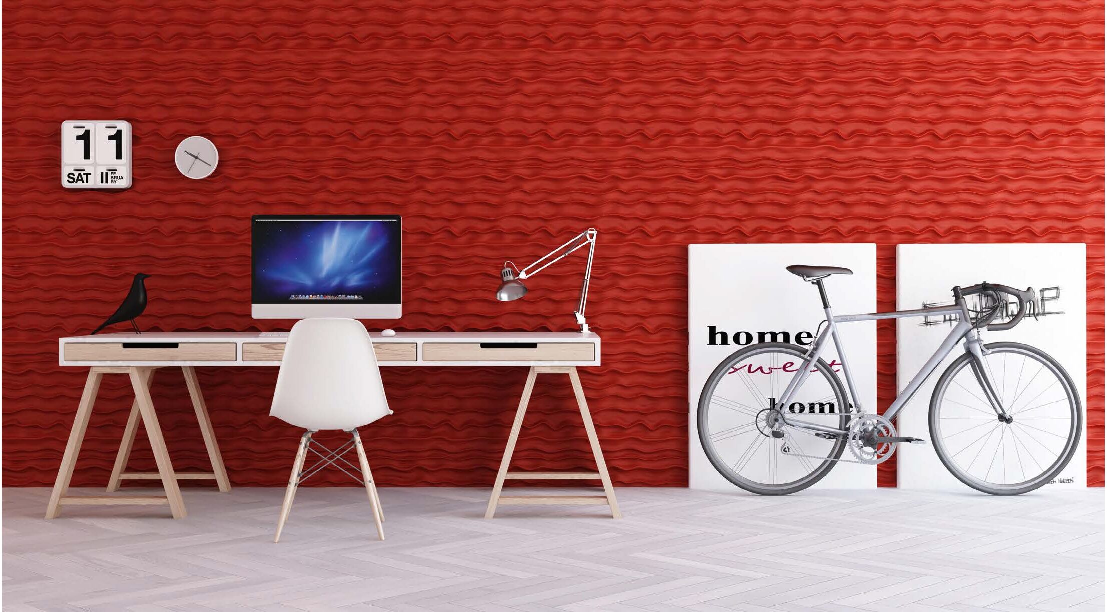 Ce panneau ressemble aux vagues de l’océan ou de la mer. Les lignes irregulières ressemblent aussi aux dunes. Un effet de la lumière donne le sentiment du mouvement et il souligne la structure des panneaux. Non seullement, il va apaiser le sens, mais aussi, il va créer la dynamique dans la pièce.