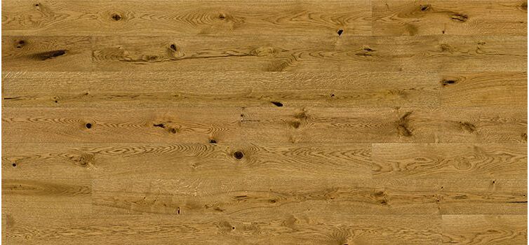 Un parquet en chêne brun chaud avec un motif de bois fort et distinctif. Les planches sont rehaussées d'un micro-biseautage sur 4 côtés et protégées par une finition vernie mate.