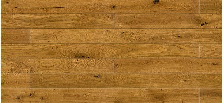 Plancher en chêne à une seule planche, protégé par une laque mate. La teinte dorée réamène les vieilles planches de chêne. De plus, les côtés du panneau ont été biseautés sur les quatre côtés.