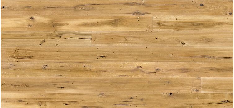 Un sol avec un motif en bois clair exposé au brossage. Surface de planche simple de la planche soulignée par chanfreinage. Laqué mat.