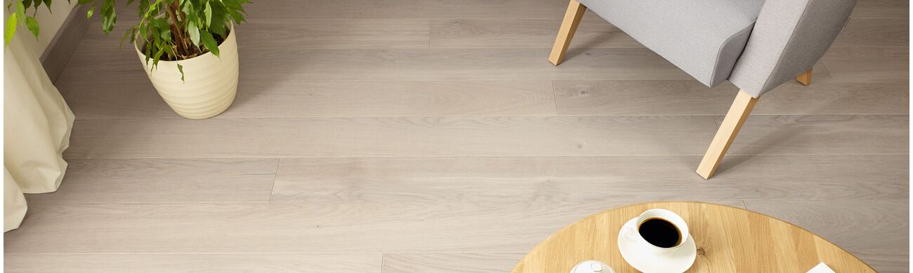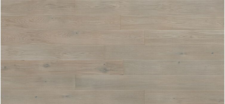 Les planches colorent une nuance de cendres et sont revêtues de laque mat. Bords nettement découpés (biseautage) avec la texture naturelle du bois apportée par le brossage.