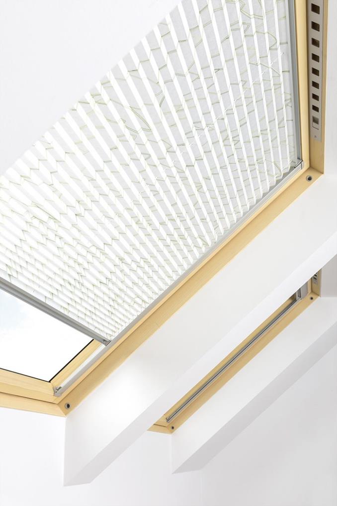 Le store plissé FAKRO APS est un store élégant et décoratif. Il permet de tamiser la lumière et donne une touche d'originalité et d'harmonie à la pièce. Le store plissé crée une ambiance agréable dans la pièce, tandis que ses couleurs se fondent avec le décor de l'intérieur. Les glissières latérales blanches cachent les bords du tissu et permettent de l'immobiliser dans la position voulue.